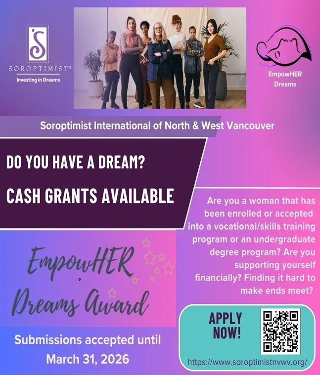 Soroptimist International of North & West Vancouver is a member-led non-profit dedicated to improving the lives of women and girls through education, empowerment, and community support. As part of a global organization with clubs in over 120 countries, this local chapter focuses on creating opportunities that help women achieve economic independence and reach their full potential.